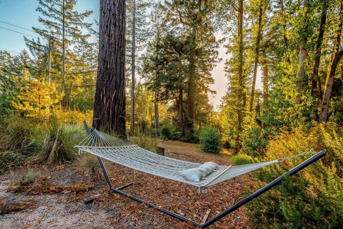 The outdoor spaces are a guest favorite. The large deck offers lounge seating, a shaded dining area, and hammocks for lazy afternoons. The yard includes a fire pit for evenings under the stars, a bocce court, a wood-fired grill and pizza oven, and seasonal vegetable garden beds. It’s a great setup for guests who enjoy cooking outdoors, relaxing, or playing games with friends or family.