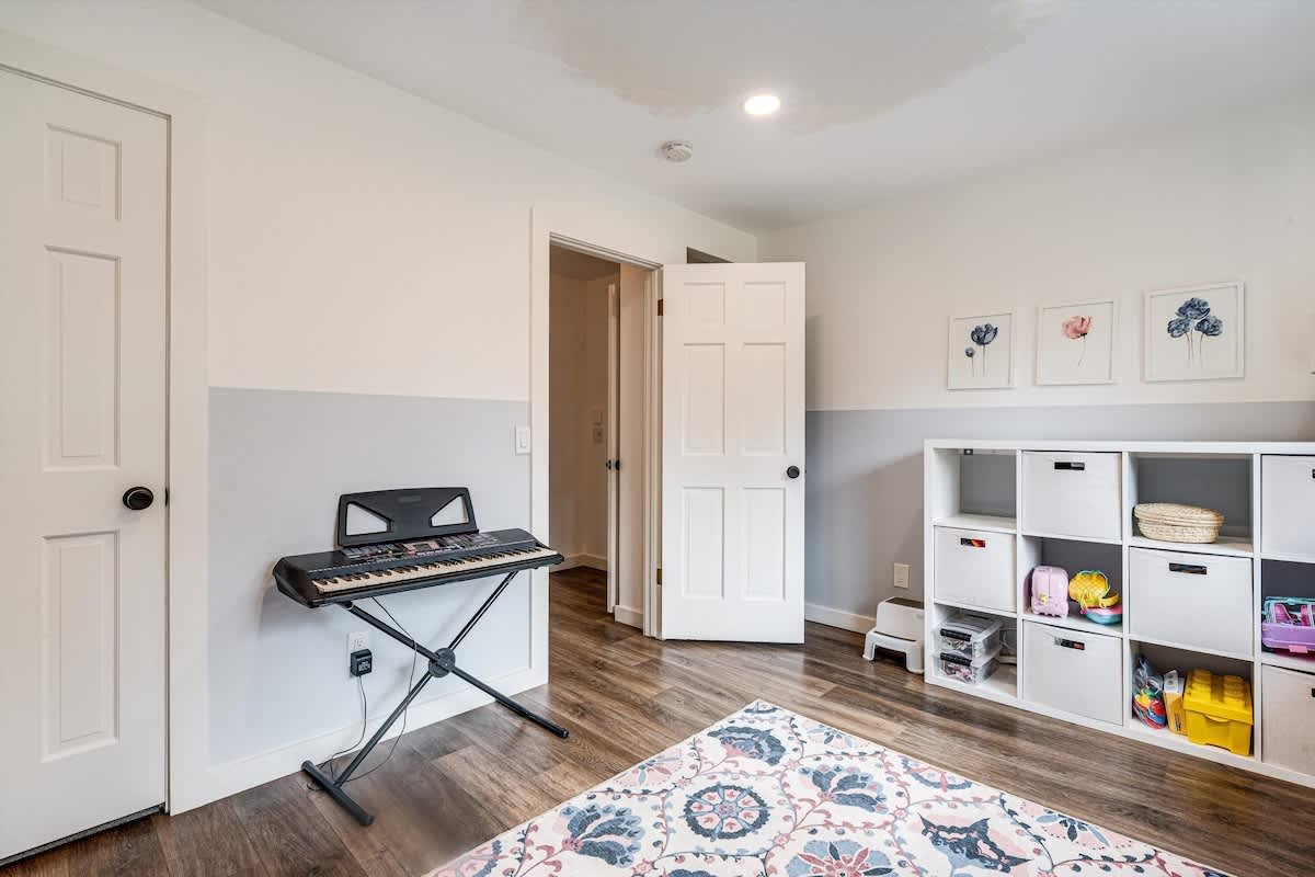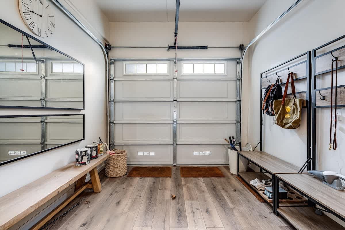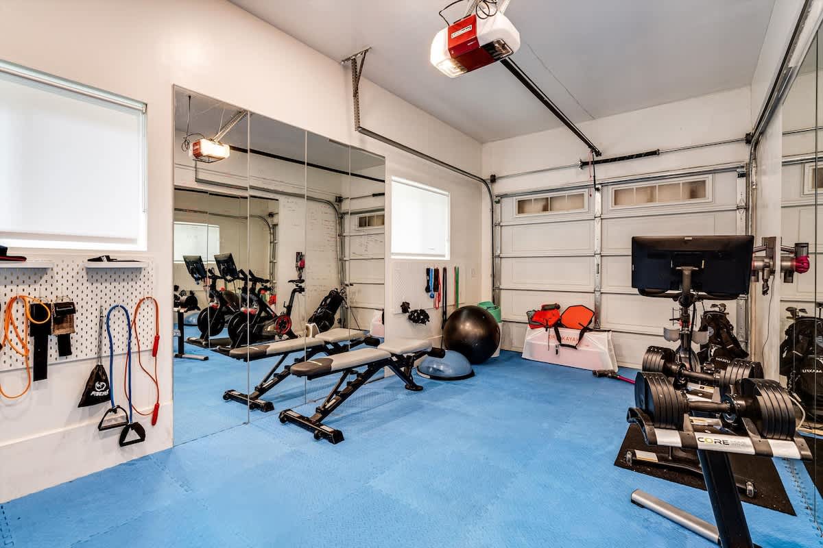 The property includes a full gym and a versatile play wall in the garage. One of the garage doors converts into a surface suitable for two-touch, handball, solo tennis drills, or light pickleball practice. Two Smart TVs—one in the family room and one in the gym—support streaming workouts or relaxing with a favorite show.