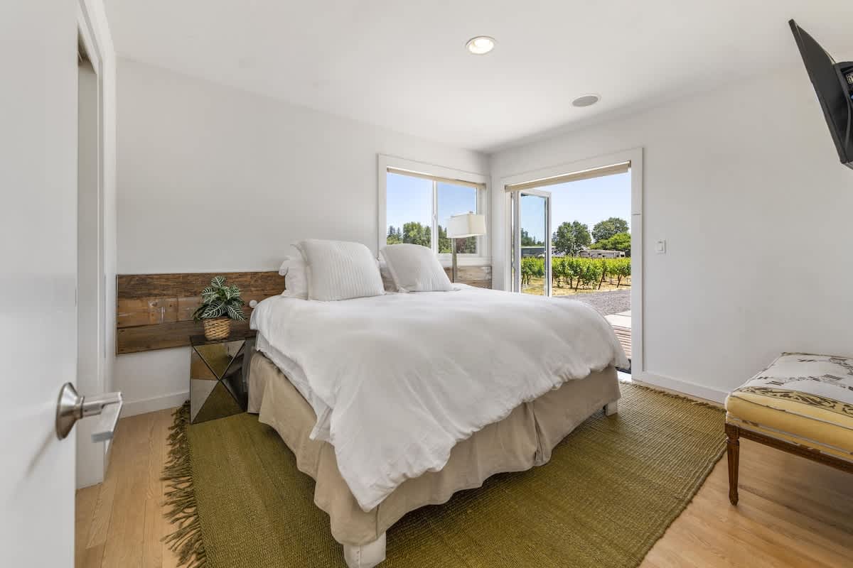 • Guest Room: King bed with deck access and vineyard views