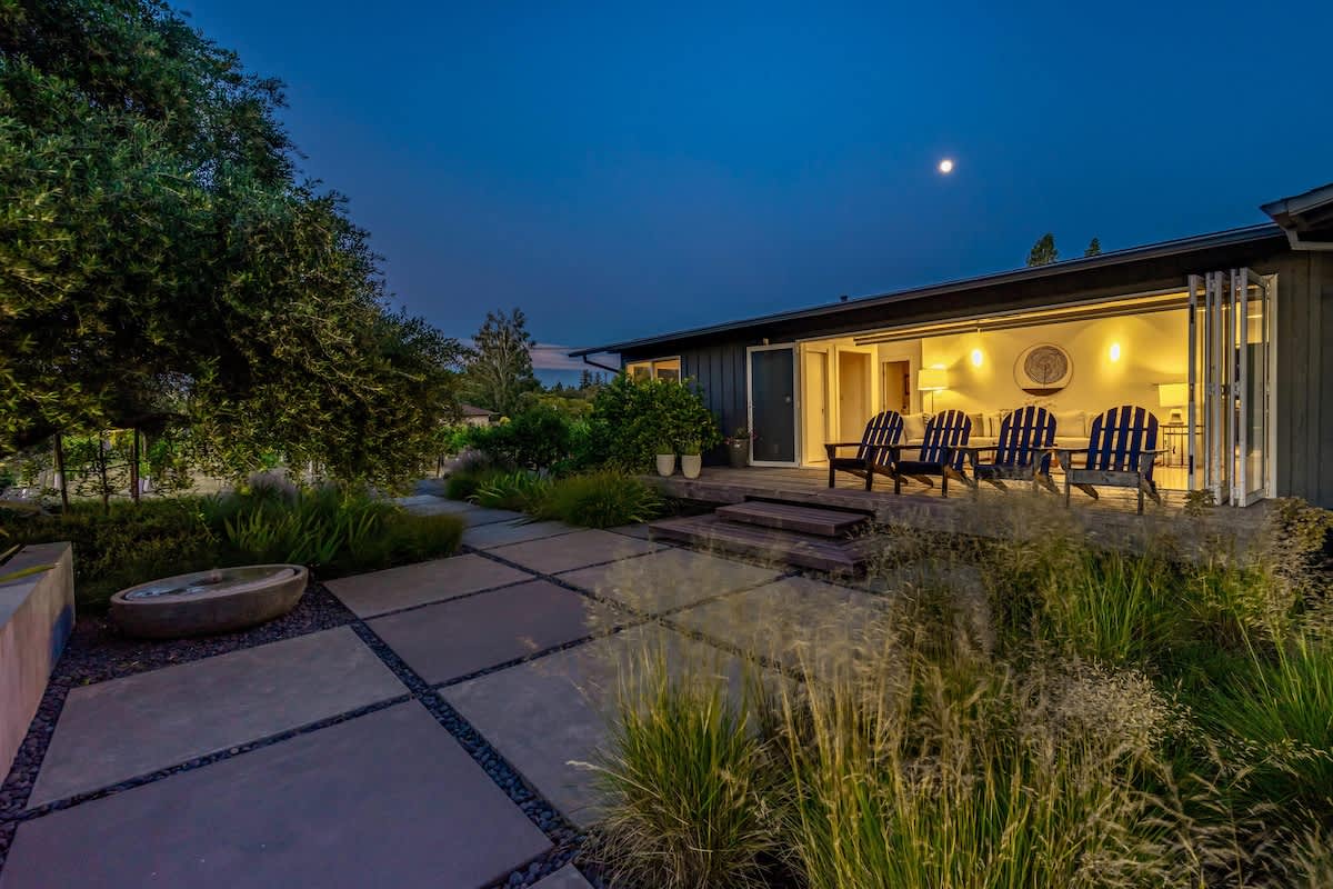 • Front deck with gardens, fountain, and scenic California countryside