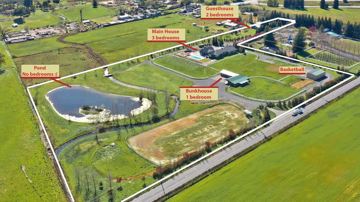 • Guest House: 2 bedrooms, 1 bath, 1,200 sq ft