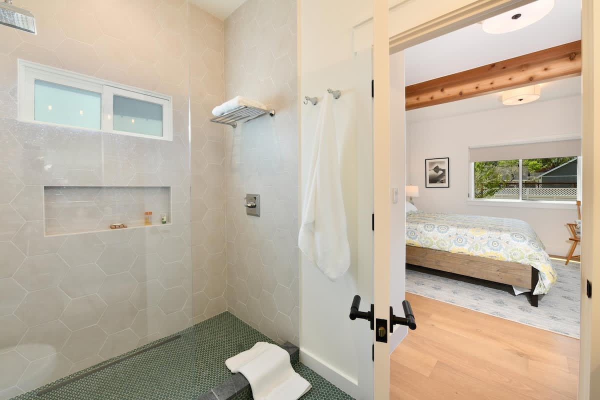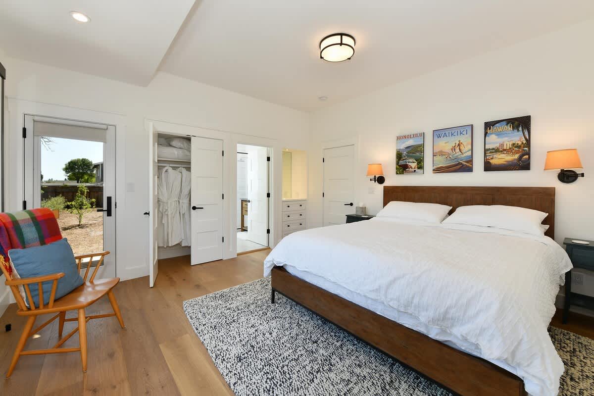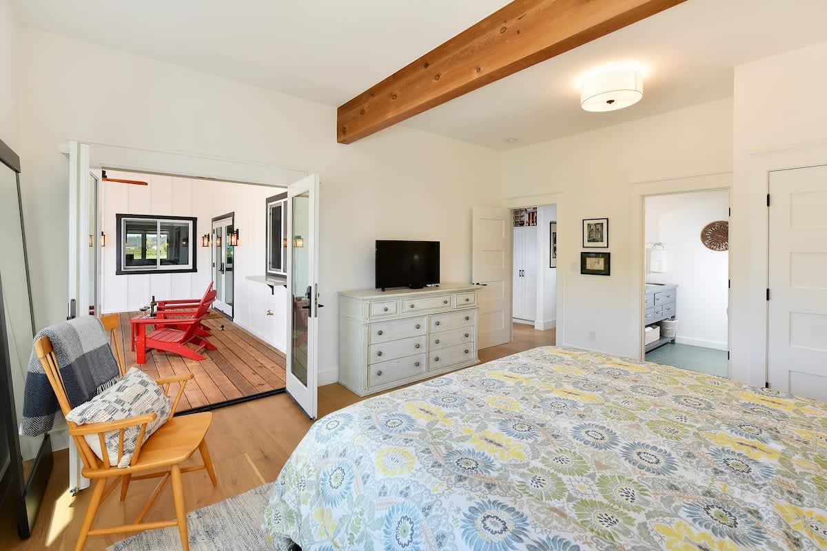 Walk to the historic Healdsburg Plaza from this modern single-level farmhouse. Vineyard Vue features 2 king en-suites, a chef’s kitchen, a wraparound porch, and vineyard vistas. Enjoy complimentary wine tastings at Merriam Vineyards and Orsi Family Vineyards.