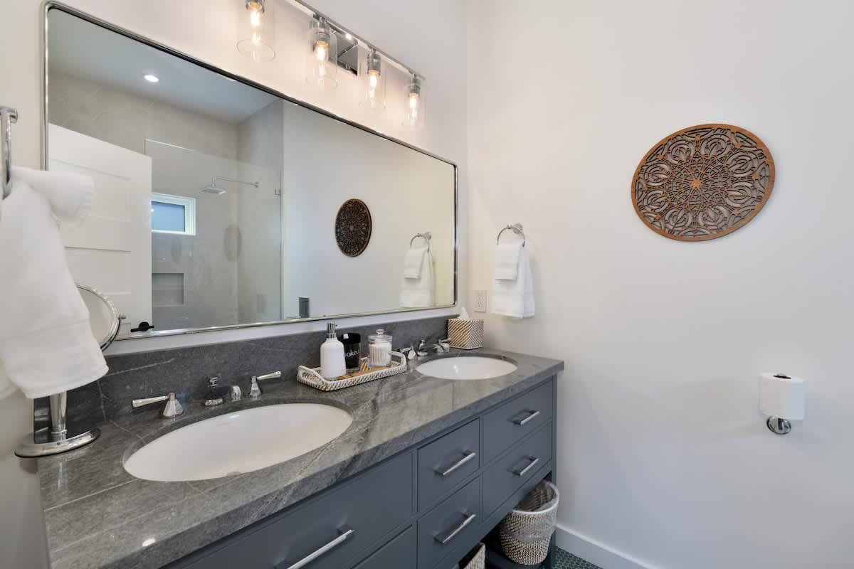 Primary Suite: King bed, walk-in shower, double vanity